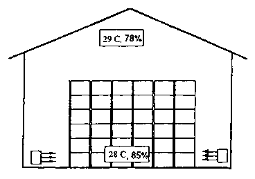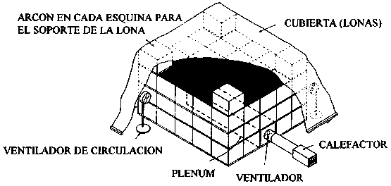 Si los calefactores se colocan cerca del techo, entonces serán necesarios unos ventiladores también en el techo para distribuir adecuadamente el calor hacia abajo, en dirección al producto. Los arcones (bins) de producto deben estibarse dejando un espacio de 10 a 15 cm (4 a 6 pulgadas) entre las filas, para una circulación adecuada del aire.