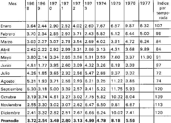 Un ejemplo de precios mensuales promedio de batatas (boniato) al por mayor en Santo Domingo, República Dominicana, durante un penado de 10 años se presenta en el Cuadro 4.5. Se calculan los promedios mensuales y sus coeficientes de variación para cada año. Un índice por temporada se calcula para cada mes del período de 10 años. Los índices por temporada trazados en forma gráfica suministran un precio al por mayor por temporada, tal como se muestra en la Figura 4.4. Esta figura indica aquellos meses en los cuales los precios son probablemente más bajos (máxima oferta) y aquellos meses cuando los precios son probablemente más altos (mínima oferta), basados en un promedio de precios de 10 años.