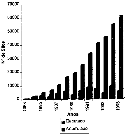 ¹ Obtener datos sobre el volumen de transferencias resultó un tanto dificil. El personal actual de la Unidad Ejecutora estima que 15,000 silos fueron distribuidos entre 1987 y 1990, y otra cantidad similar entre 1990 y 1993; de las 30,000 unidades distribuidas, la mitad podrían estar todavía en uso. Otra fuente (comunicación personal: APROPA) estimó que el volumen de transferencias solo fue unos mil silos opinando que la iniciativa del Gobierno obedecía al deseo de "inundar al mercado" imitando la iniciativa de APROPA.