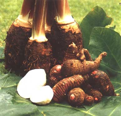 Colocasia, nom scientifique du "vrai" taro, est l'un des tubercules les plus répandus dans les régions tropicales humides. Il peut atteindre environ un mètre de hauteur et produire des tubercules comestibles d'une trentaine de centimètres de long. Les feuilles et les tiges de cette plante entrent également dans la composition de beaucoup de plats insulaires.