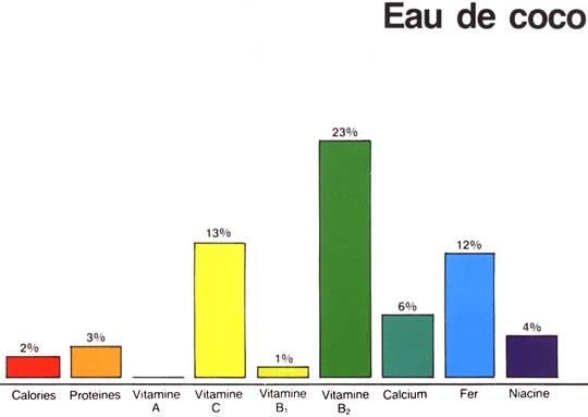 Les histogrammes montrent que l'eau de coco est plus nutritive que les boissons non alcoolisées. Celles-ci sont souvent chères, ne contiennent que du sucre, de l'eau et des colorants et, pour l'argent qu'elles coûtent, elles n'ont qu'une faible valeur nutritive. Les Océaniens font bien mieux de boire l'eau des cocos verts ou du toddy qui sont bon marché, énergétiques et riches en éléments nutritifs.