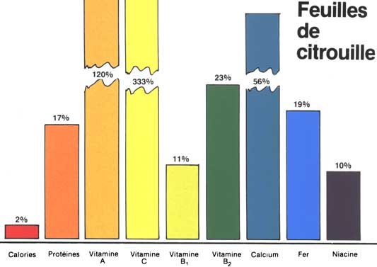 Les feuilles vert foncé de la citrouille sont une excellente source de vitamine A, qui est nécessaire à une bonne croissance, à la santé des yeux et à la prévention des maladies. Les feuilles sont également une bonne source de calcium, de vitamine C, de fer et de protéines. Le calcium donne des os et des dents solides. La vitamine C assure la résistance des tissus, aide le corps à assimiler le fer et facilite le métabolisme. Le fer est bon pour le sang et l'organisme a besoin de protéines pour se développer et rester sain.