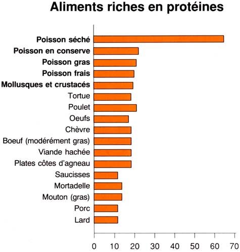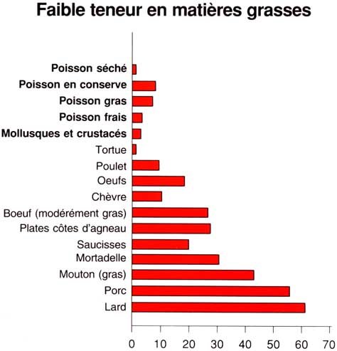La plupart des poissons contiennent de très faibles quantités de matières grasses et d'huiles. L'huile du poisson est spéciale. Elle contribue à maintenir les vaisseaux sanguins en bon état, ce qui évite les problèmes de tension artérielle et les cardiopathies. Le tableau comparatif sur la teneur en matières grasses indique que le poisson est un excellent aliment reconstituant pour les enfants comme pour les personnes désireuses de perdre du poids. Comparé aux saucisses, à la viande de mouton, à la bavette d'agneau, à la viande de boeuf ou de porc, et à la poitrine fumée, le poisson est généralement maigre.