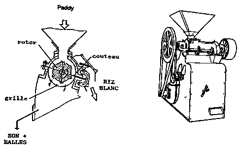Dans le futur, pour les installations dont le volume d'activité annuel dépasserait les 500 T de paddy, il sera certainement nécessaire de promouvoir le remplacement progressif des décortiqueurs Engelberg par des unités compactes associant décortiqueur à rouleaux et blanchisseur pneumatique ou abrasif (fig. n° 5). Ces unités compactes ont, en effet, des capacités plus importantes (500 kg/h à 800 kg/h) et permettent d'améliorer les rendements d'usinage.