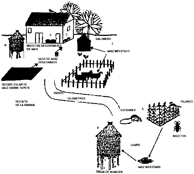 Un esquema de 3 agroecosistemas creado y manejado por granjeros en el oriente de Ghana y Togo. A. Ecosistema del campo de cultivo lejos de La casa. B. Ecosistema del almacen de grano en el que el maíz es almacenado en una troja. C. Ecosistema del almacen de granos en el cual Las mazorcas o maíz desgranado es almacenado en sacos. D. Secado solar de maíz desgranado húmedo sobre un tapete o superficie de concreto. E. Ecosistema de animales en el recinto de La vivienda donde ovejas, cabros y pollos se alimentan con Los granos que no son normalmente para el consumo humano.