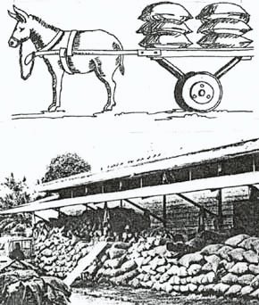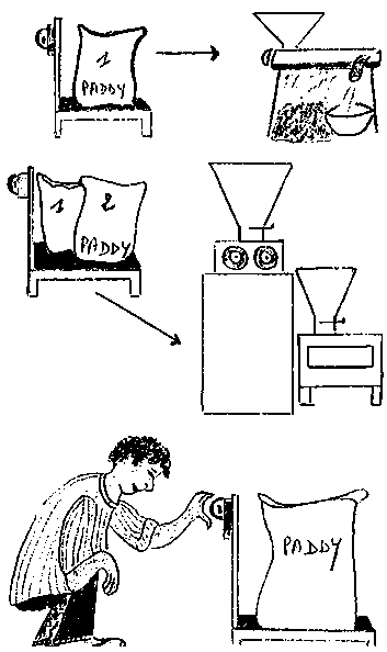 pour un sac de paddy dans le cas d'une petite décortiqueuse (max 300 kg/h)pour deux sacs de paddy dans le cas d'une machine de plus grande capacité.