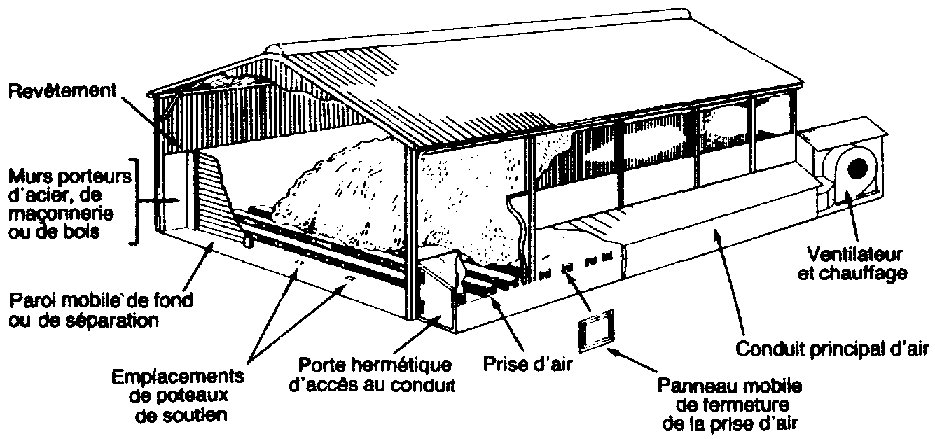 Un ventilateur propulse l'air à travers les grains étalés sur le plancher perforé. En principe, l'air est chauffé avant de passer à travers le produit. Une fois séchées, les céréales sont enlevées, refroidies, puis entreposées. Ce système permet un séchage rapide, mais sa construction coûte cher. Il exige également du matériel qui n'est pas toujours à la portée des agriculteurs. En outre, il faut compter l'achat du combustible qui fera fonctionner le ventilateur et les frais d'entretien du matériel. Il existe de nombreux exemples de ce type de séchoir. La figure 6.10 en donne une illustration.
