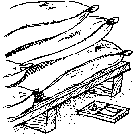 Finalement, la méthode la plus satisfaisante pour éliminer et combattre les insectes dans les sacs de grain est la fumigation. Elle consiste à libérer un gaz parmi les sacs recouverts d'une bâche étanche aux gaz, maintenue contre le sol par des boudins de sable ou par une grosse chaîne gainée de toile d'emballage (fig. 7.10). On garde la pile ainsi bâchée pendant au moins trois jours.