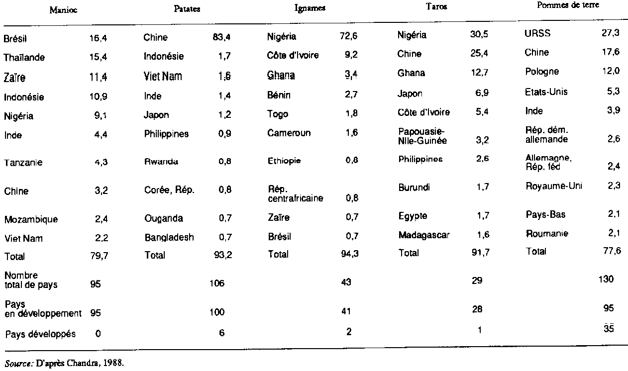 De 1965 à 1984, la production mondiale de manioc a augmenté de plus de 330 pour cent. Cela correspond à un taux de croissance annuel de 4,3 pour cent, chiffre important pour n'importe quelle culture vivrière (Chandra, 1988). Les changements récents dans la production mondiale calculés en 1986, en prenant 1984 comme année de référence, ont montré que la production du manioc a augmenté de 5,2 pour cent celle de l'igname de 4,8 pour cent et celle du taro de 3,7 pour cent. Si la production mondiale (comprenant celle de la patate et de la pomme de terre en zones tempérées) a baissé respectivement de 3,8 pour cent et de 1,8 pour cent, la position de ces deux végétaux dans certains pays en développement continue de se renforcer. La production de patates entre 1969-1971 et 1981-1983 s'est accrue de 3,4 pour cent par an en Afrique subsaharienne (FAO, 1986a), et selon des pourcentages allant de 6,3 pour cent par an (Viet Nam) à 1,1 pour cent par an (Thaïlande) dans certains pays d'Asie (FAO, 1987b). L'accroissement de la production de pommes de terre dans quelques pays asiatiques a été de 7,8 pour cent par an pour l'Inde, 6,2 pour cent pour la Chine, 10,2 pour cent pour Sri Lanka et 13,8 pour cent pour le Viet Nam, entre 1970-1972 et 1982-1984. Depuis 1970, il y a eu aussi des hausses importantes dans la production de pommes de terre à Cuba, en Colombie, au Venezuela et dans une bonne partie de l'Amérique centrale, grâce à l'adoption de nouvelles technologies.