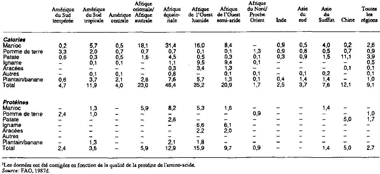 La teneur en protéines des racines, tubercules, bananes et plantains varie, de même que la qualité de ces protéines. L'igname et la pomme de terre en contiennent davantage, approximativement 2,1 pour cent en poids frais. La quantité de protéines fournies par ces aliments dans les pays en développement, corrigée en fonction de la qualité des acides aminés est, en moyenne mondiale, seulement de 2,7 pour cent, fournis principalement par les pommes de terre et les patates. Toutefois, ces aliments féculents de base assurent une plus grande partie de la ration protéique en Afrique (tableau 4.8), allant de 5,9 pour cent en Afrique de l'Est et en Afrique australe à un maximum de 15,9 pour cent en Afrique de l'Ouest humide, fournis principalement par l'igname et le manioc. Ces chiffres ne comprennent pas les protéines apportées par les feuilles de végétaux comme le manioc, la patate et le taro qui sont consommées comme légumes verts. La teneur en acides aminés des racines et tubercules, contrairement à la plupart des céréales, n'est pas complétée parcelle des légumineuses car toutes deux sont pauvres en acides aminés soufrés (tableau 4.9). Afin de maximiser leur apport de protéines dans l'alimentation, les racines et tubercules devraient être complétés par une grande variété d'autres aliments, dont des céréales.