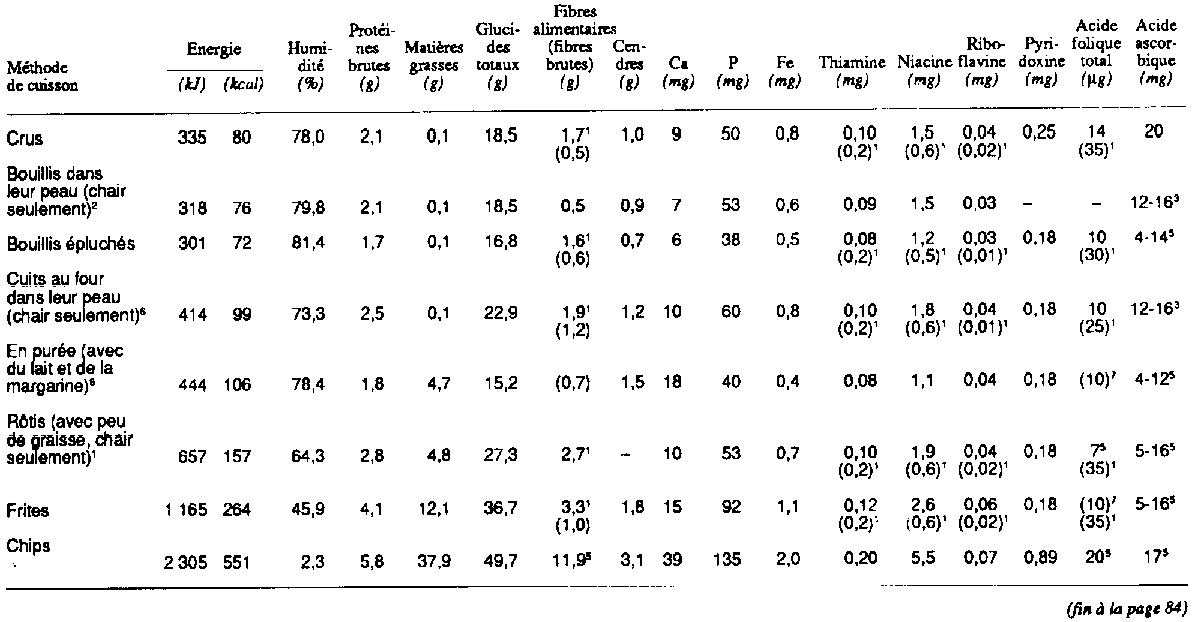 Tableau 6.8 Pourcentages des allocations journalières recommandées pour un adulte fournies par des portions de 100 9 de produits transformés à base de pomme de terre