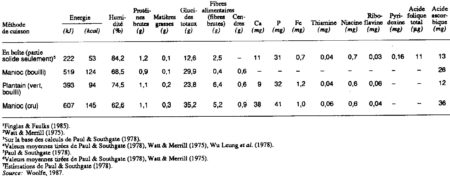 Durant la préparation du gari (tableau 6.5), plus d'un tiers des protéines disparaît, et les pertes sont plus élevées avec le foufou et le lafun (Oke, 1968). Les minéraux subissent aussi une réduction sensible, à l'exception du ter qui augmente, probablement parce qu'on utilise une poêle en fer pour faire frire le produit (tableau 6.6). Quand l'igname est cuite à l'eau, à la vapeur ou au four, sa teneur en fibres augmente à cause d'une modification de l'amidon et certains minéraux sont détruits, en particulier le phosphore et le potassium (tableau 6.4). La transformation influe sur le pourcentage des éléments nutritifs qui seront fournis par la patate, comme le montre le tableau 6.8. L'augmentation de 6,6 pour cent de la teneur en maltose de la patate durant la cuisson ne se retrouve pas dans d'autres racines, qui contiennent probablement moins d'amylases (Tamate et Bradbury, 1985).