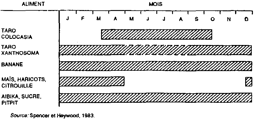 Dans de nombreuses régions de plaine en Papouasie-Nouvelle-Guinée, les précipitations et l'agriculture de subsistance ont un caractère saisonnier marqué. Les variations saisonnières dans les disponibilités alimentaires sont considérablement réduites par la culture du taro. Comme l'indique la figure 9.1, deux espèces de taro, Colocasia et Xanthosoma, se complètent l'une l'autre en fournissant des calories pendant la période de végétation. La banane aussi, en tant que source de calories en toutes saisons, aide à régulariser les approvisionnements et assure la sécurité alimentaire des ménages tout au long de l'année.