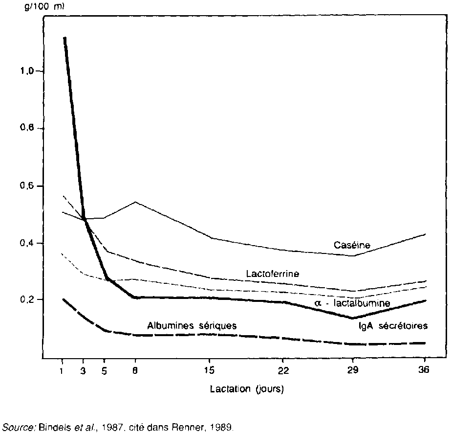Les quantités de lactoferrine (figure 1 ) et de Iysozyme du colostrum sont élevées et diminuent au cours de la lactation. Les taux de lactoferrine diminuent moins vite que ceux des immunoglobulines. Les deux glycoprotéines échappent à la digestion gastrique et pancréatique et se retrouvent en grande partie dans les selles. Toutefois, selon certains auteurs, près d'un quart de ces protéines peut néanmoins être nutritionnellement utilisé (Nichols et a/. 1987) ce qui dans l'absolu représente des quantités appréciables.