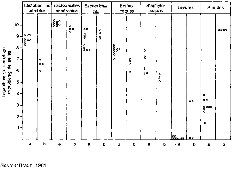 FIGURE 3 Flore fécale chez les enfants allaités (a) et nourris au biberon (b)