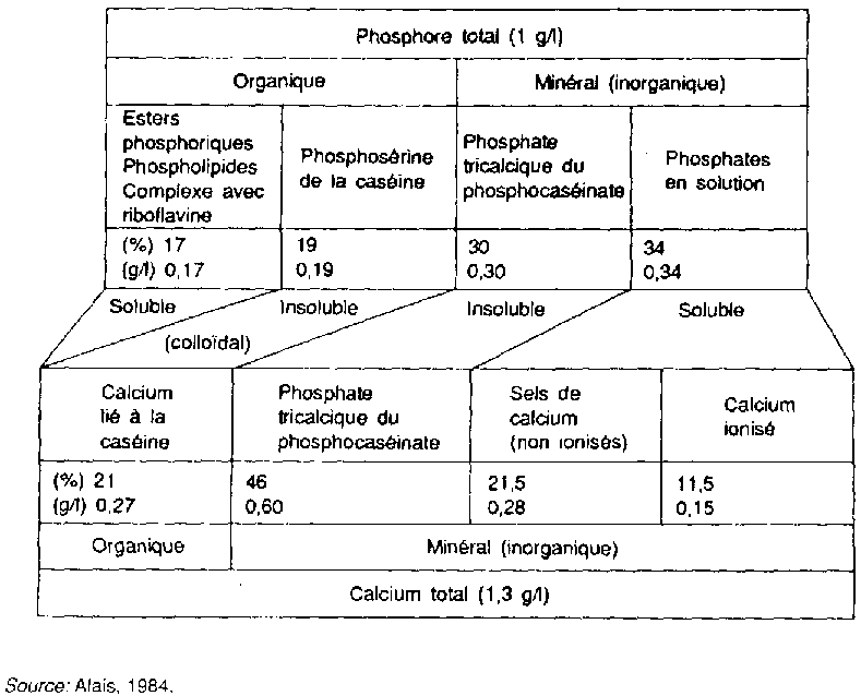 Le calcium existe sous forme de phosphate, de phosphocaséinate et de citrate. Environ 65 pour cent du calcium se trouve au sein des micelles de caséines (fraction colloïdale) où cet ion bivalent assure un pontage entre les micelles de caséines, le tiers résiduel étant présent soit sous forme de sel (citrate, phosphate: >20 pour cent) ou même à l'état libre (calcium ionisé: >10 pour cent). Pour ce qui est du phosphore, 20 pour cent est lié aux groupements hydroxyles d'acides aminés de la caséine (sérine, thréonine), plus de 60 pour cent est présent sous forme de phosphate inorganique (moitié lié à la caséine, moitié en solution saline) et le reste se partage entre les phospholipides et les esters hydrosolubles (figure 6). Le magnésium est essentiellement en solution (environ 70 pour cent) et une fraction seulement est liée à la caséine en suspension colloïdale.
