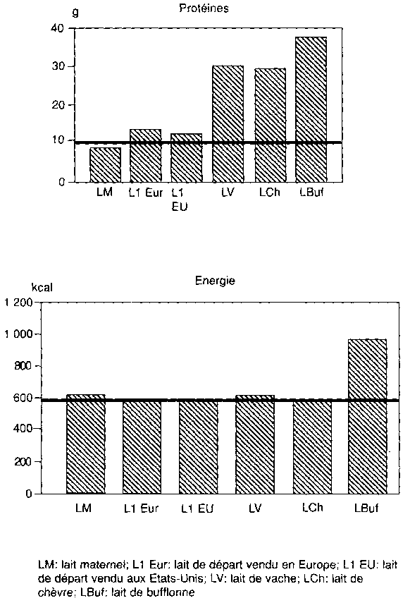 L'adaptation des laits animaux pour la consommation infantile tient compte également de la charge osmotique rénale. Les capacités rénales de concentration chez le nouveau-né et le nourrisson sont faibles, et encore moindres chez le prématuré. De ce fait, les déchets métaboliques azotés et minéraux entraînent avec eux dans la phase d'excrétion rénale une quantité importante d'eau. Dans la pratique, le lait maternel est surtout remplacé en période d'alimentation lactée exclusive (de O à maximum 4 mois en général) par un nombre limité de produits: du lait de vache (parfois coupé), du lait de chèvre ou des formules adaptées (dérivées du lait de vache). Ces dernières diffèrent quelque peu selon qu'elles ont été conçues en Europe (laits adaptés du premier âge) ou en Amérique du Nord (lait standard pour la première année). La figure 21 et le tableau 66 illustrent le taux de couverture de l'ensemble des besoins de la tranche d'âge concernée par l'un et l'autre de ces produits lactés. D'emblée, les insuffisances ou dépassements en nutriments qu'entraînent les divers régimes lactés sont visibles.