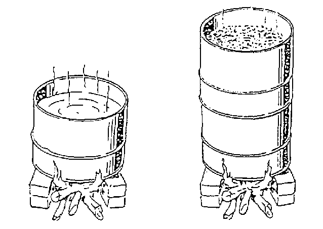 Une technologie d'étuvage a été introduite à partir d'un dispositif très simple (figures 3.5 et 3.6). Un fût métallique de 200 litres est coupé en deux demi-fûts. Le demi-fût supérieur percé de petits trous contenant le paddy est placé au-dessus du second demi-fût contenant l'eau à bouillir. Un foyer en brique d'argile limite la consommation de bois au strict minimum (15 kg de bois pour 50kg de paddy).