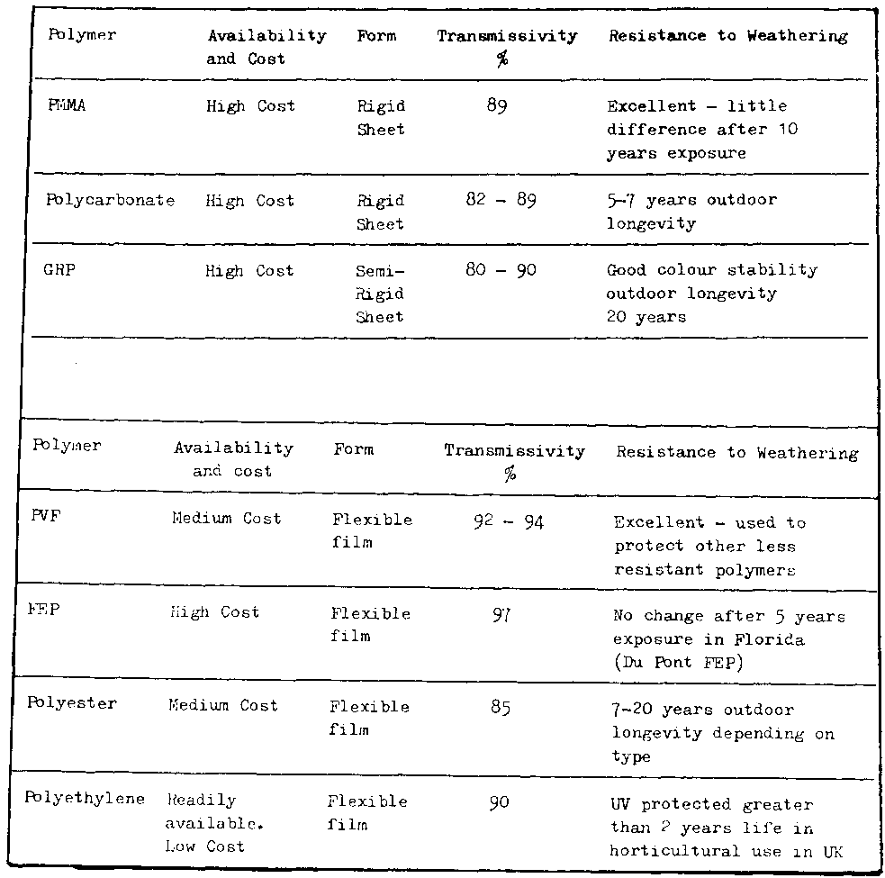 PMMA is used in the form of a rigid sheet which can be thermoformed to different shapes. ICI have subjected "Perspex" to outdoor exposure over a period of 10 years in the UK with only a 4% loss in transmissivity. A similar time under tropical conditions resulted in only slight discolouration. PC sheet is sesceptible to micro-cracking when exposed to outdoor weathering, even in the standard UV stabilised form and so existing commercial polycarbonate glazing material is not adequately protected against UV radiation. GRP is light, has a high light transmissivity and good impact resistance. When protected either by stabilising to resist UV degradation or by coating with PVF film this material shows good resistance to weathering. In unprotected forms the surface of the sheet develops micro-cracks and develops fibre prominence' both of which decrease its light transmissivity.