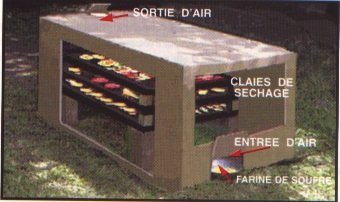 1) Au début du séchage, lorsque le contenu en eau libre des denrées est à son maximum, il est plus efficace de favoriser une circulation d'air rapide pour évaporer l'eau libre qu'une température trop élevée. La température au début de la déshydratation doit être basse pour éviter le durcissement de la membrane des tissus. Les fruits dont la membrane a durci deviennent durs. secs, se réhydratent mal, perdent de la saveur et une partie de leur valeur nutritive. Pour permettre un flux d'air élevé il suffit d'ouvrir de 25 cm du côté nord les fenêtres plastifiées du séchoir en briques d'argile. (Voir Chap. 111)