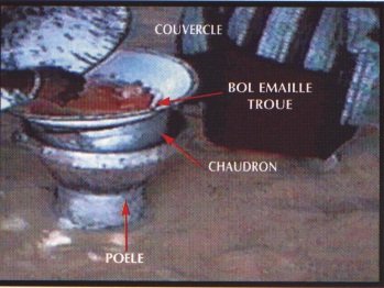 - Un récipient profond de 20 à 30 cm avec un couvercle bien ajusté pour éviter que la vapeur s'échappe. Un gros chaudron dans lequel on prépare les repas peut être utilisé. Si le couvercle ferme mal, on le remplacera par une planche assez grande pour couvrir l'ouverture du récipient. ( figure 6)