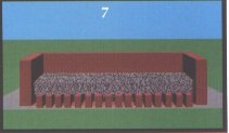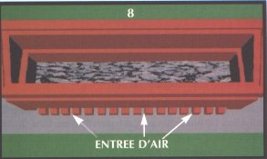 Avant de débuter le prochain niveau de briques, on disposera des cailloux (ou des morceaux de métal) noir de 6 à 9cm (ou le plus foncé et le plus lourd que possible) sur les entrées d'air. Il faut éviter que le gravier tombe à l'intérieur des petites canalisations d'entrée d'air. Après que les entrées d'air auront bien été recouvertes de gravier on continuera d'empiler les cailloux jusqu'à une hauteur d'environ 15 à 18 cm (Dessins 7, 17)