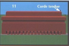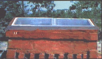 Après avoir posé une rangée de briques sur tout le pourtour du Sème niveau (dessin 10) on posera deux rangées de briques sur le mur nord seulement. Le mur nord aura alors environ 1,30 mètres de hauteur à partir du niveau du sol et le mur sud environ 95cm. Une corde sera alors tendue entre le dessus du mur nord et le dessus du mur sud. (dessins 11 ) En suivant la pente de cette corde le maçon fermera les murs est et ouest avec des briques entières et des morceaux taillés (dessin 14).