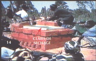 Ces briques sont ensuite posées sur une base de boue d'argile selon l'axe nord-sud et distantes les unes des autres d'environ 5 à 8cm. On laissera dépasser ces briques d'environ 15cm du côté sud seulement. Du côté nord les briques viennent rencontrer, à la même hauteur, la deuxième rangée de briques. Pour notre séchoir des briques ainsi disposées créeront de 16 à 17 tunnels où l'air libre pourra s'engouf