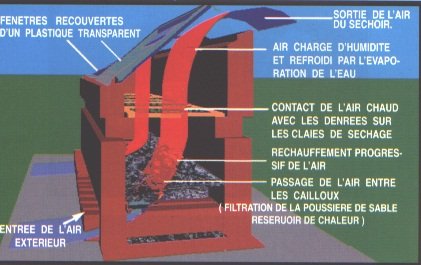 Le mouvement de l'air chaud vers le haut crée un vide partiel qui induit l'air frais à pénétrer par les ouvertures à la base du séchoir. En se mouvant ainsi du bas vers le haut l'air chaud absorbe, à son passage près des surfaces poreuses des denrées, les vapeurs d'eau qui s'en échappent.