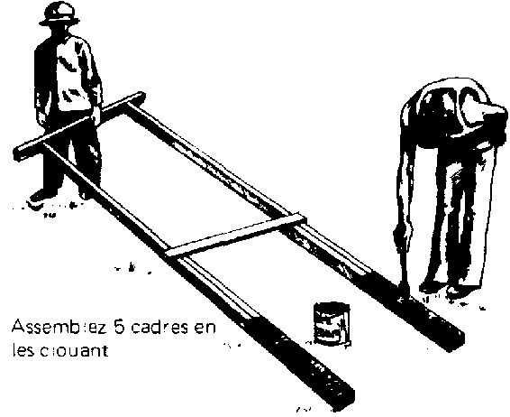 Puis 2 longues . . . et 2 courtes . . . continuant alternativement à poser longues tiges et courtes tiges pour élever les murs jusqu'au niveau de la charpente. Attachez les tiges aux montants verticaux tout les posant.
