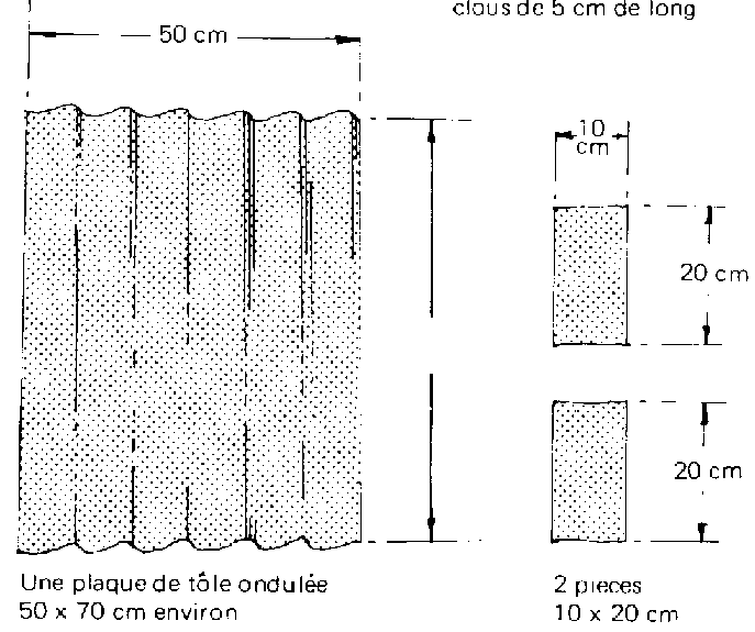 Un bon toit de chaume est la couverture idéale. Si vous le souhaitez,faîtes le toit avec des tôles d'acier galvanisé. Dans ce cas il faut 4 tôles de 2 m de longueur pour un grenier norma I.