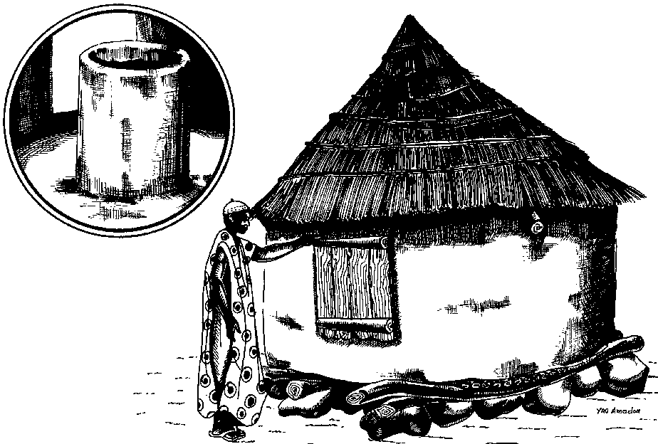 Le modèle de grenier traditionnel, utilisé dans la région, consiste en une structure cylindrique en banco, ayant un diamètre de 2 à 4 m et une hauleur moyenne de 1,5 à 1,80 m. Elle repose sur une plate-forme en branchages, soutenue par de grosses pierres. Une toiture en paille recouvre le corps du grenier. Une porte-fenêtre rectangulaire, mesurant en moyenne 80 à 100 cm sur 50 cm, en permet l'accès (cf. figure G.1). De petits compartiments, destinés à séparer divers produits, sont aménagés dans les greniers appartenant aux femmes.