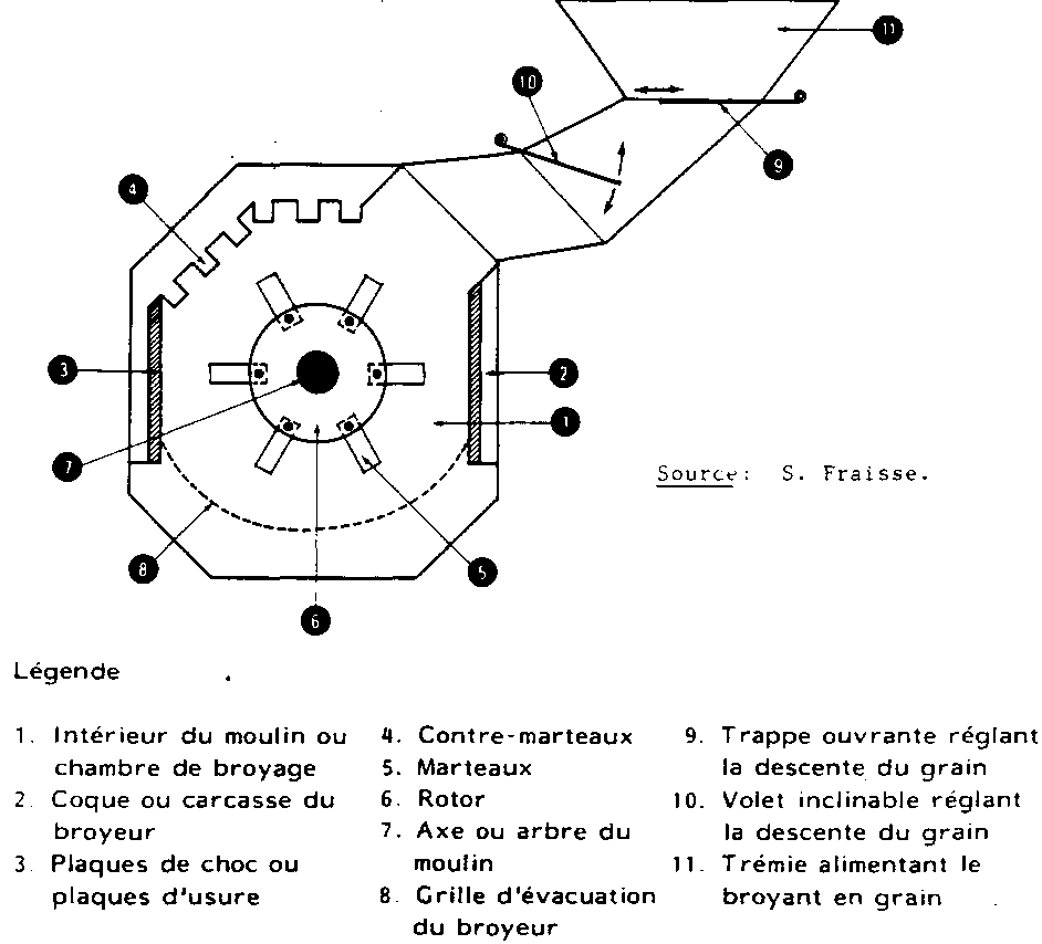 v) le taux d'humidité du produit à broyer: il semble qu'une variation d'un pour cent du taux d'humidité du grain comporte environ une diminution de 10 pour cent du débit. De plus, un taux d'humidité trop élevé entraîne le colmatage de la grille;