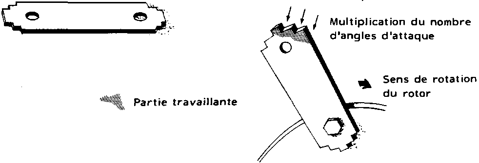 1.1.3. Le rôle des marteaux est de frapper le grain et de lui fournir des vitesses de rotation suffisamment élevées pour permettre sa pulvérisation contre les parois du broyeur. Pour augmenter le débit, l'on peut multiplier les angles d'attaque des marteaux en leur donnant un profil irrégulier (cf Schéma 5). Les marteaux peuvent être mobiles, articulés sur leurs axes ou fixes. Ces derniers sont parfois appelés marteaux à lames. Les marteaux, tout comme les plaques de choc, doivent être en matériaux résistants. Les marteaux les plus couramment fabriqués en Europe sont des lames épaisses d'acier traité, de forme rectangulaire. Selon les constructeurs, les marteaux réversibles sur quatre faces garantiraient le broyage d'environ 200 tonnes de céréales.