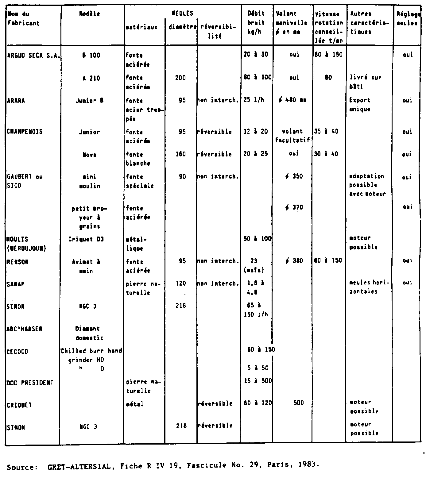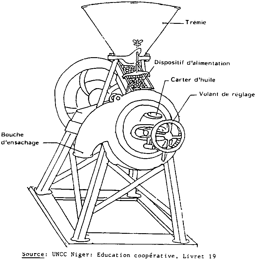 1 2.7. Il existe de petits moulins à meules manuels dont le débit moyen est d'environ 30 à 40 kg/h. La plupart est à volant ou à manivelle, et ils sont équipés en général de meules de 9 cm de diamétre; leur coût est nettement inférieur à celui des moulins à moteur. Leur utilisation n'est pas très répandue Tantôt elle est perçue comme une corvée harassante par la plupart des utilisatrices, "plus fatigant que le pilage". Dans certains endroits cependant (la région d'Agadez au Niger par exemple), leur utilisation est perçue comme une amélioration par rapport au procédé traditionnel. Ces différences peuvent avoir un fondement technique (par exemple montage des paliers sur roulement à billes ou pas), mais aussi un fondement social, l'installation d'un moulin à moteur étant perçue comme un élément de prestige pour le village d'implantation.