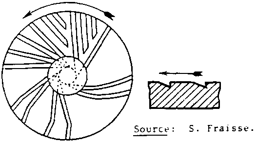 1.2.4. Les meules sont des disques comportant des rainures d'alimentation qui répartissent le grain sur toute leur surface pour qu'il soit broyé. Ces rainures, plus profondes vers le centre, s'amenuisent graduellement vers les bords afin que le grain ne puisse s'échapper que lorsqu'il est finement moulu. Les rainures permettent également une aération qui modère une élévation excessive de température. Après usure, il est nécessaire de retailler les rainures à la sortie (cf Schéma 7).