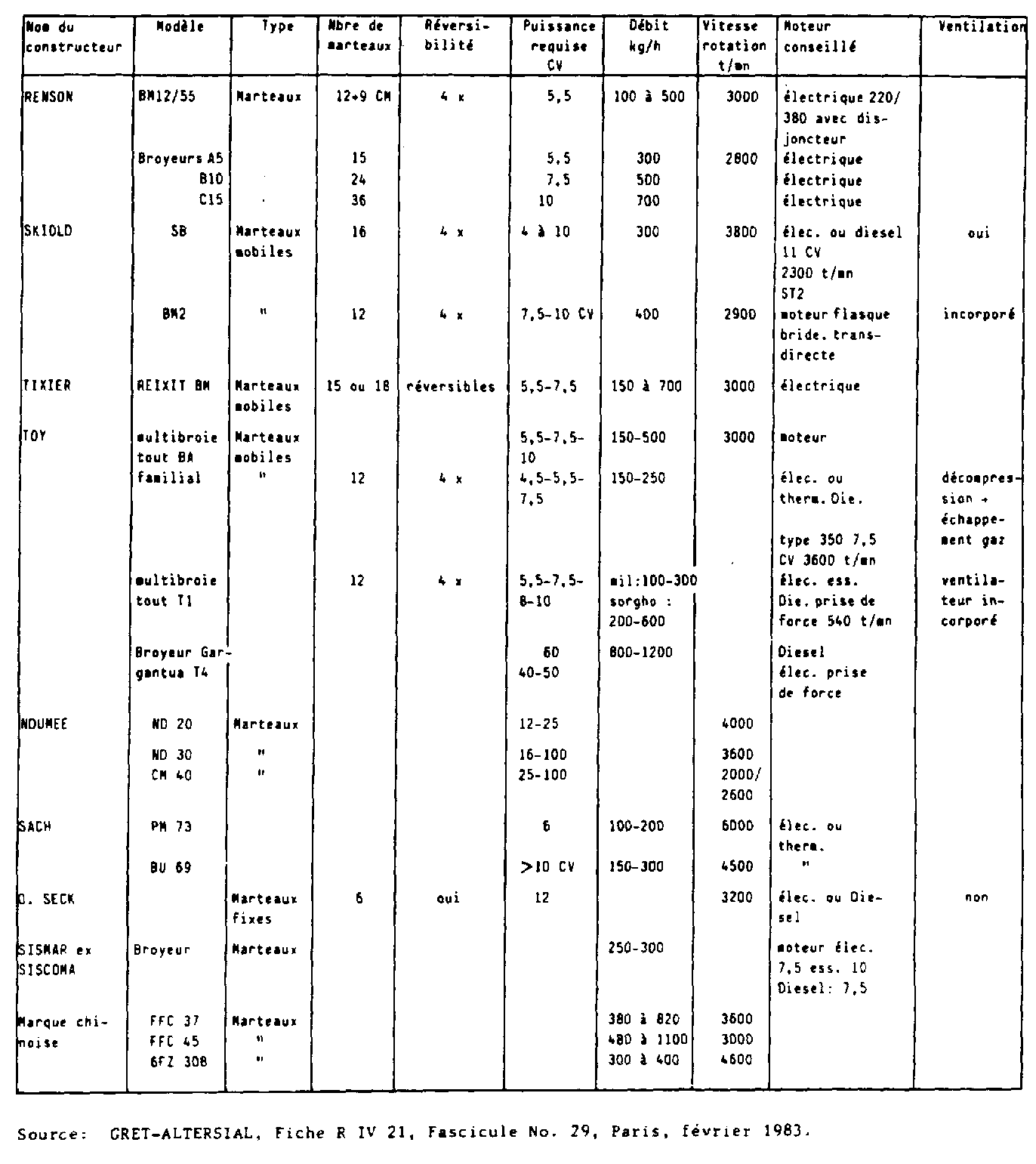 1.1.8 La plupart des broyeurs à marteaux sont importés; (cf Annexe II pour une liste du matériel existant). Des broyeurs à marteaux fixes sont à l'heure actuelle entièrement fabriqués au Sénégal dans des ateliers artisanaux équipés de postes de soudure, Souvent les artisans sont plus disponibles que le personnel des firmes d'importation et peuvent consacrer plus de temps à la formation des villageois; ils assurent aussi un suivi plus serré des appareils.