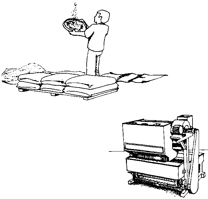 Esta operación se puede realizar en forma manual, aventando el grano sobre una lona plástica, o mecánicamente por medio de máquinas de limpieza. Las máquinas de limpieza no sólo limpian los granos, sino que también se pueden utilizar para separarlos, de acuerdo con su forma; están diseñadas para separar los materiales aprovechando las diferencias en los pesos específicos de los componentes de la masa de granos. El proceso consiste en hacer flotar los residuos más livianos de los granos sobre una corriente de aire, mediante el auxilio de agitación mecánica (figura 36).