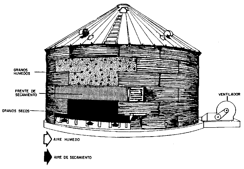 Cómo ocurre el secado en el silo. El secado a bajas temperaturas se inicia en la parte inferior del silo y va progresando hasta alcanzar la parte superior. Durante el período de secado se pueden distinguir, en el silo, tres capas con distinto contenido de humedad (figura 12). En la primera capa, que está formada por granos secos, el producto alcanzó su equilibrio higroscópico con las condiciones del aire. En la segunda capa, llamada frente de secado, el aire está absorbiendo humedad del producto; generalmente el espesor de esta capa varía entre los 30 y los 60 centímetros. La tercera capa está formada por granos húmedos, cuyo contenido de humedad puede ser superior al inicial, ya que el aire pasa por esta capa saturado, sin capacidad de secado; la temperatura de esta capa habitualmente es inferior a la temperatura del aire que entra al silo, debido a que el aire se enfria en el frente de secado por la evaporación de la humedad.