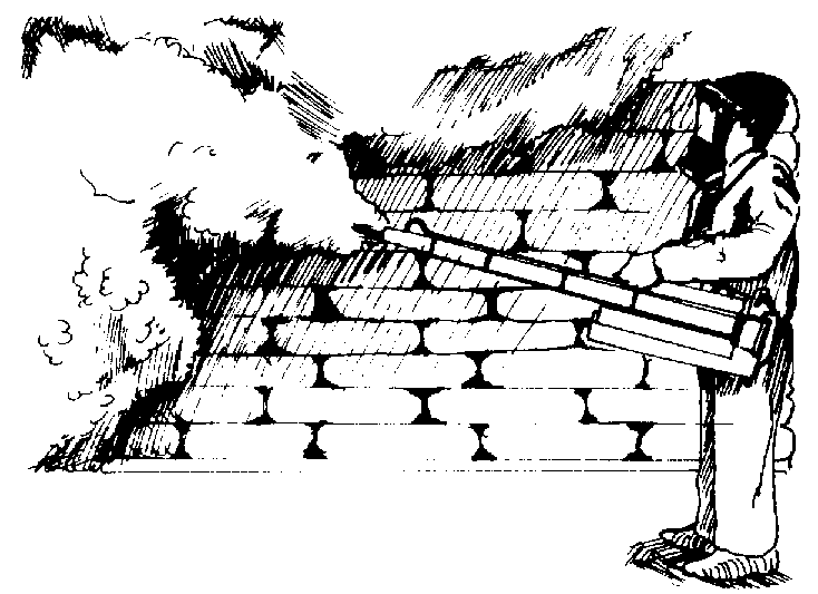 Vaporización o producción de niebla ("nebulización"). Este es el proceso por el cual se obtiene la producción de gotas pequeñísimas con el uso del calor; en este caso se alcanzan gotas de un diámetro menor a 50 micras. El insecticida pulverizado debe ser lo bastante volátil para que, al mezclarse con el aceite diesel, produzca una humareda con pequeñas partículas que permanecen en suspensión en el aire por algún tiempo. Este método combate los insectos que vuelan, como las polillas y las moscas. Sin embargo, también mata otros insectos directamente alcanzados por el insecticida en paredes y otras superficies (figura 20). Para esta operación se utilizan termovaporizadores o nebulizadores, que convierten el insecticida mezclado con diesel en una densa niebla que llega a todas partes del almacén (cuadro 4).