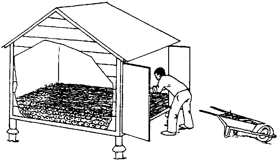 Edificios a prueba de roedores. En el caso de un depósito de madera, debe elevarse el piso de modo que quede como mínimo a unos 80 cm por encima del suelo. Alrededor de los pilares se deben colocar barreras contra ratones para impedir que trepen por ellos (figura 62). En un almacén tradicional es necesario cubrir las paredes externas con argamasa de cemento liso hasta unos 60 cm de altura, y procurar que las puertas y ventanas ajusten perfectamente (figura 63).