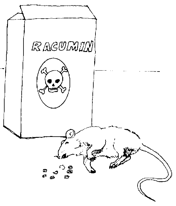 Rodenticida de acción lenta. Son productos que provocan el envenenamiento de los ratones, en dosis pequeñas, por lo que los animales no lo advierten cuando comen el cebo. Actúan inhibiendo la formación de la protrombina y producen hemorragias internas que los llevan a la muerte. Los principios activos de los productos utilizados son: hidroxicumarinas (warfarina, fumarina) e indandionas (pival, valona, difacinona).