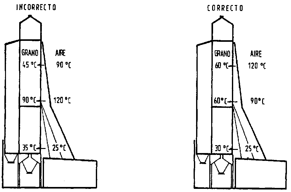 Es conveniente emplear mayores temperaturas del aire de secado en la primera parte de la sección de secado, donde el grano está más húmedo, y menores temperaturas en la segunda parte, cuando el grano está más seco, refiriéndose en especial al maíz.