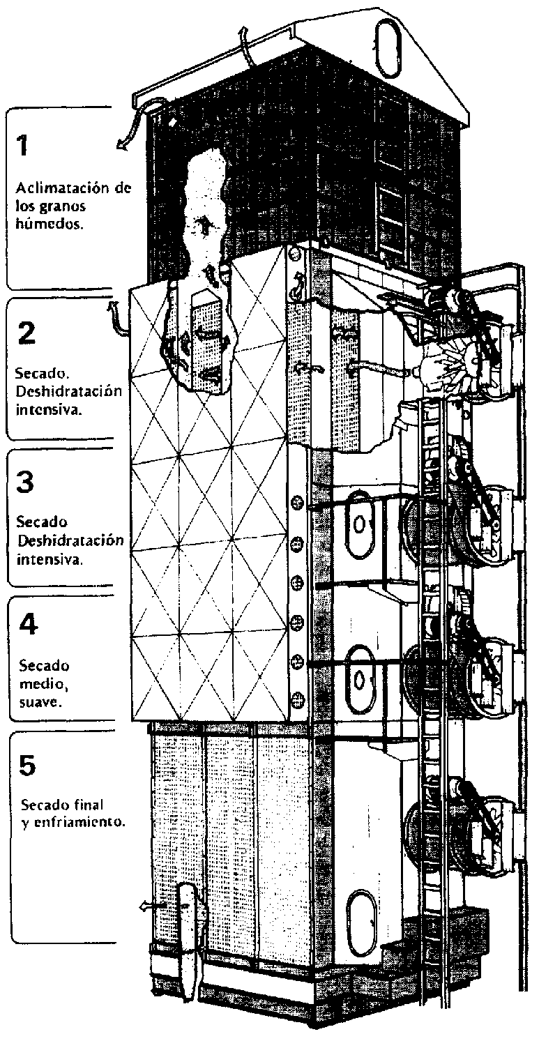 Hay que decir, también, que existen secadoras que tienen varios quemadores a distintas alturas de la torre de secado, y que cada uno suministra una temperatura determinada y uniforme, que van descendiendo desde arriba hacia abajo (Figura 37), situación que favorece una mejor eficiencia de la máquina.