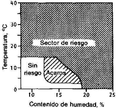La temperatura y el contenido de humedad son los dos factores que se ha aprendido a controlar para evitar el deterioro durante el almacenamiento. En la Figura 6.1 se representan combinaciones de estos factores, que se han demostrado eficaces para un almacenamiento sin riesgos contra agentes concretos. En la Figura 6.2 se muestra el efecto combinado.