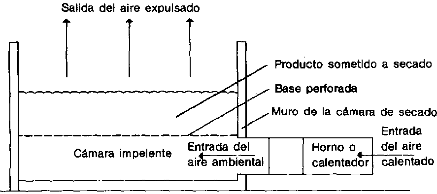 Otro método es el secador de convección con calor añadido. El secador Brook (Figura 6.9) es un ejemplo de secador de convección. Se extiende el producto en una capa delgada sobre una base perforada. La base forma el techo de una cámara impelente que contiene una fuente de calor. Conviene que los lados de la base per forada se alarguen lo más posible hacia arriba, pero teniendo en cuenta que para cargar y descargar el producto hay que superarlos, a no ser que se trate de lados desmontables (con lo cual aumenta el costo). El aire entra por la cámara impelente a través de los orificios que hay en sus extremos, se calienta y pasa a través de la base perforada y luego por entre el producto que ha de secarse, por convección natural.