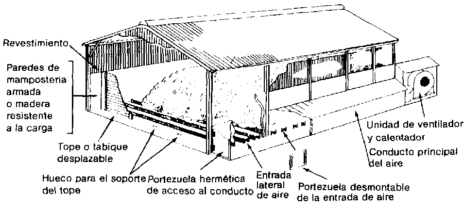 El grupo de los secadores de producto almacenado con ventilación forzada comprende sistemas de arcones ventilados y secado de producto almacenado en el suelo. Ambos se utilizan para grandes cantidades de grano a granel. Se necesita considerable pericia y experiencia para hacer funcionar con éxito estos sistemas. En las Figuras 6.14 y 6.15 se muestran ejemplos de este tipo de secador.