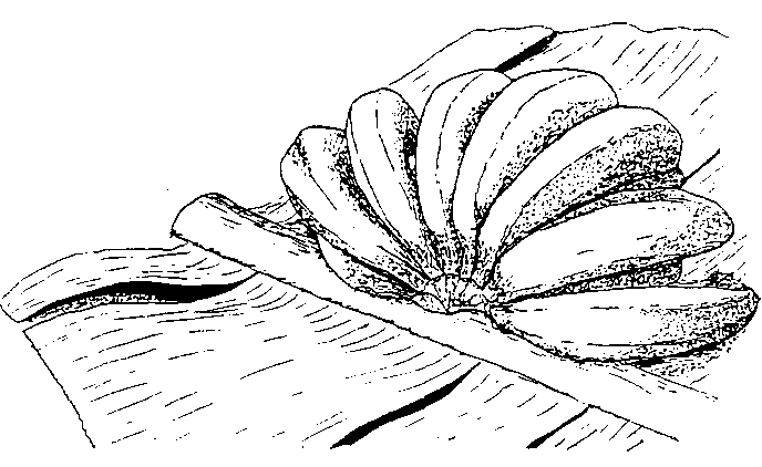 Une fois détachées de la tige, les mains devraient être aussitôt déposées, face incurvée vers le haut, sur des feuilles de bananier fraîches, transversalement par rapport aux nervures centrales (figure 37). Cela empêchera le latex de l'incision de souiller les fruits. L'écoulement du latex devrait cesser au bout de 12 à 15 minutes; la banane est alors prête à être emballée dans des cageots ou, mieux, dans des cartons à rabats ou télescopiques. Les mains entières peuvent être divisées en petits régimes de quatre fruits ou plus qui seront emballés de façon plus compacte, ce qui permettra d'avoir un plus grand poids de fruits par carton.