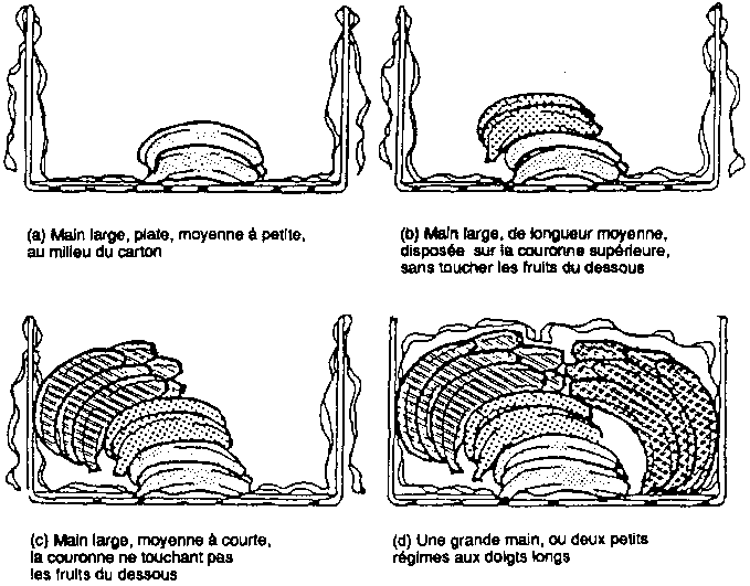Les mains ou les petits régimes doivent être emballés dans les cartons côté incurvé vers le haut, comme indiqué à la figure 38; il faut veiller à ce que les couronnes des mains du dessus n'endommagent pas les bananes du dessous. Les cartons doivent être pleins sans déborder, sinon ce seront les fruits et non pas les parois du carton qui supporteront les cartons du dessus de la pile, et ainsi se trouveront abîmés.