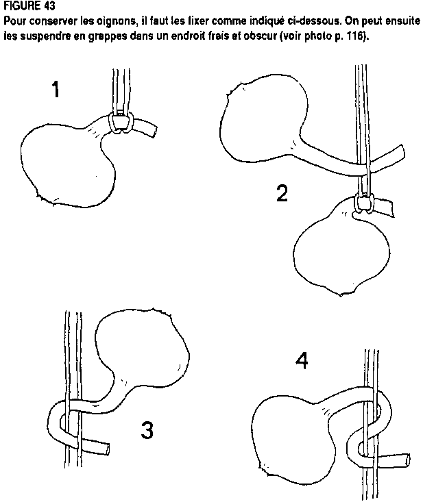 Lorsqu'il s'agit de petites quantités, une méthode de stockage très efficace consiste à suspendre des tresses d'oignons de 5 kg ou 10 kg dans un endroit sec et bien ventilé. Les tiges des oignons ne doivent pas être sectionnées car elles seront liées à un double raphia (figure 43), chacune étant tressée en 8 dans ces raphias. On peut aussi lier les tiges desséchées en bottes qui seront suspendues à l'ombre, à une corde ou une perche horizontales.